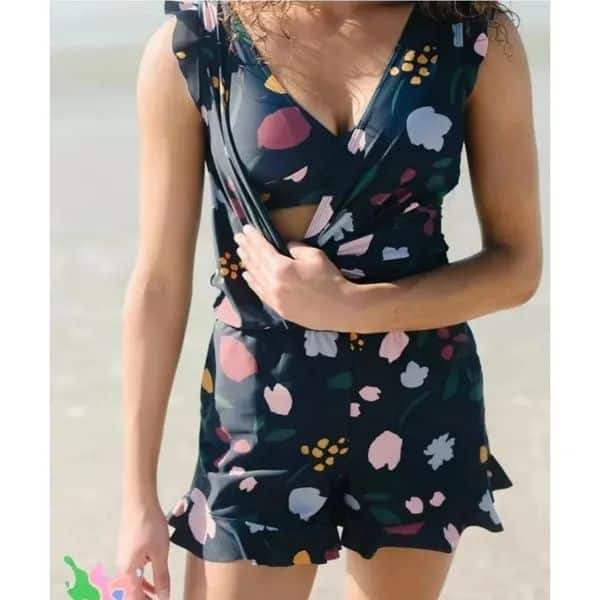 The Swim Romper is features with crossed v-neck, ruffle shoulder, and hem design, nursing-friendly for moms, and creates a flattering look in style, Ruffled sleeves and shorts come for a sophisticated take on a tropical-inspired look.